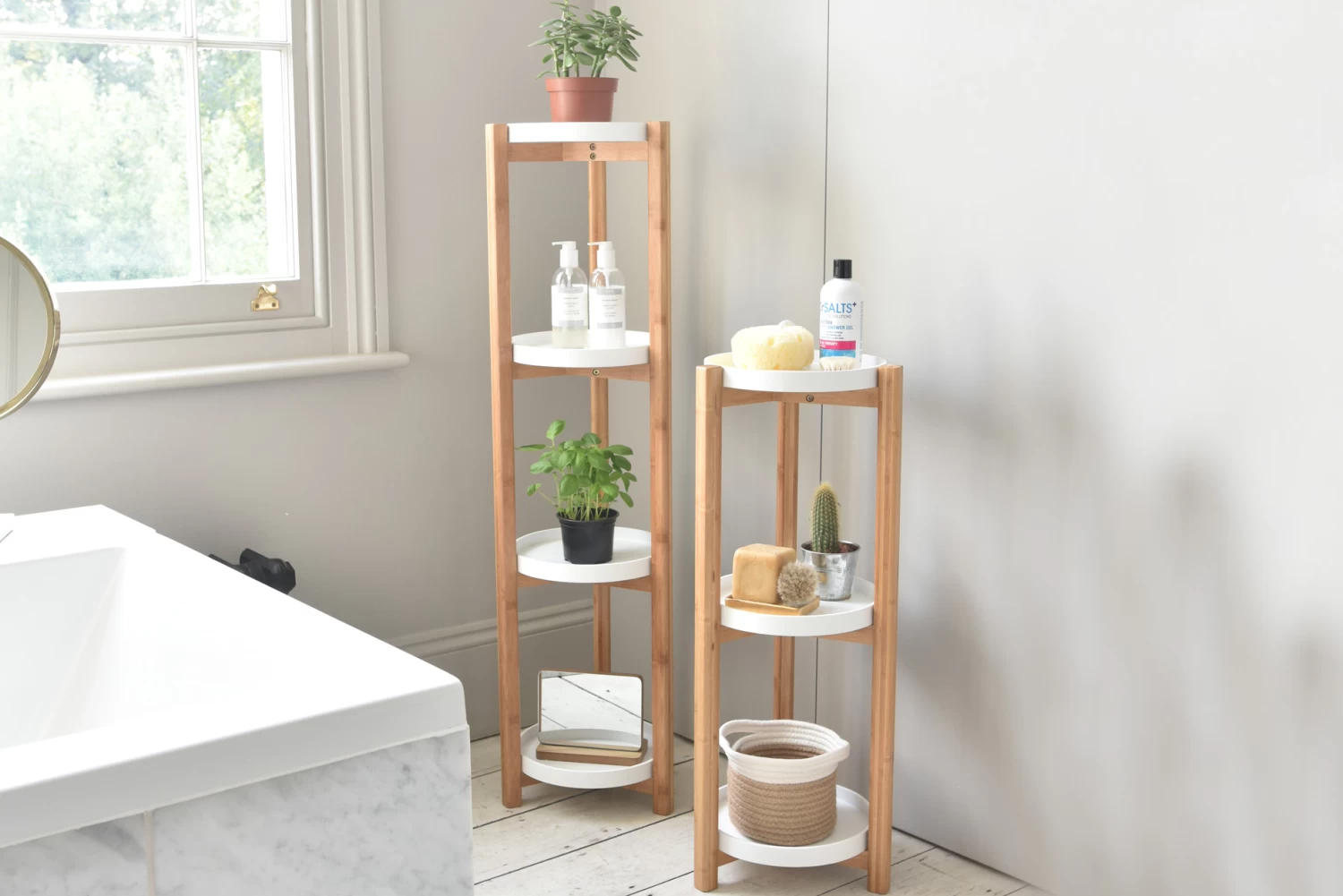 The ultimate in sublime skinny storage, our round 4 tier shelves bring a stylish storage solution to the bathroom – or any other small space that’s in need of some space saving cleverness. Made in bamboo and white MDF, this support system for clutter is a serious style staple.