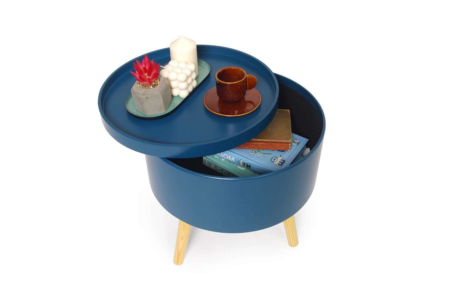 This circular side table works well in the bedroom or living room and comes complete with a lift-off tray top that reveals handy storage – the perfect hiding place for stashing remotes and phone chargers.