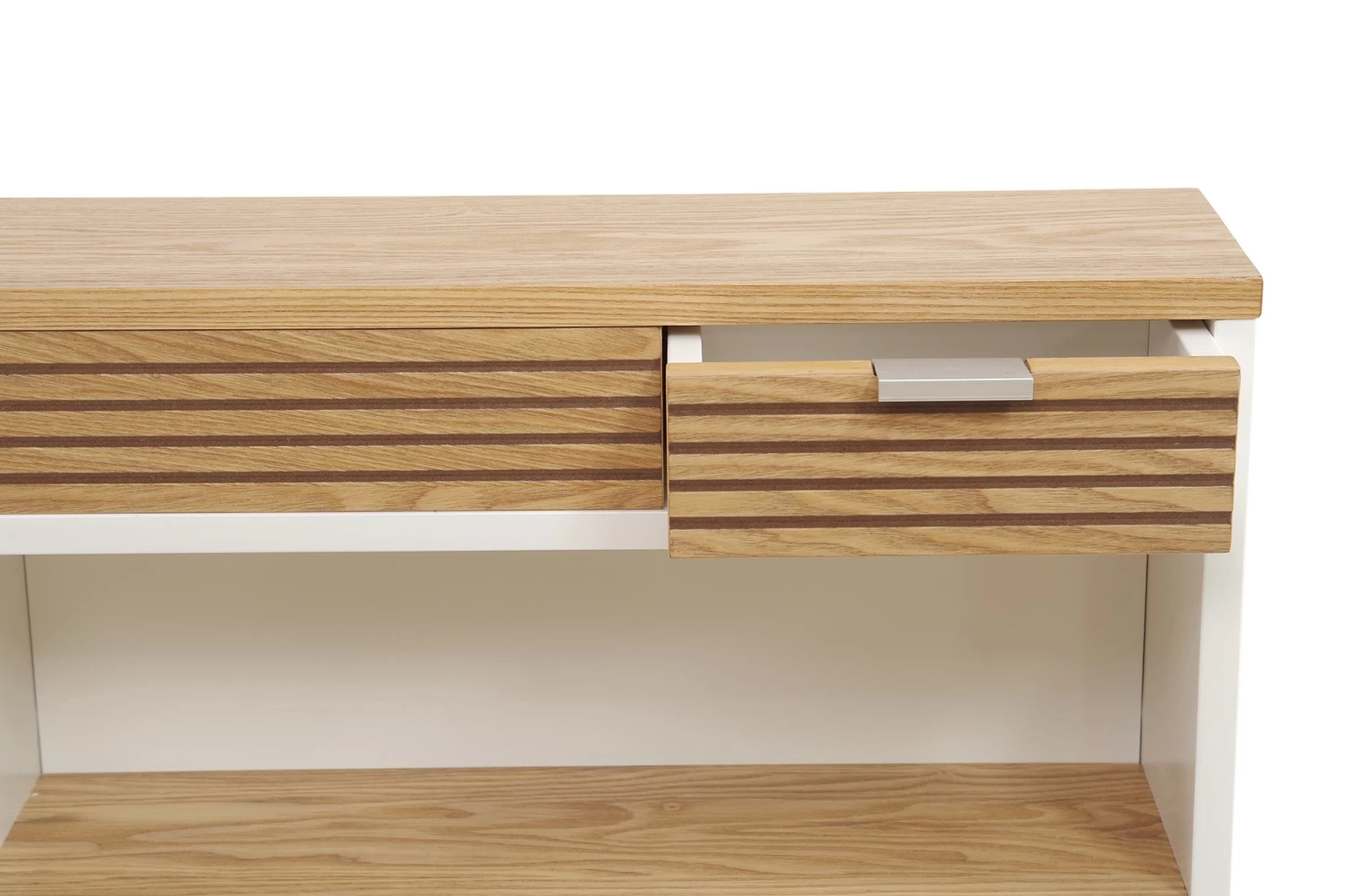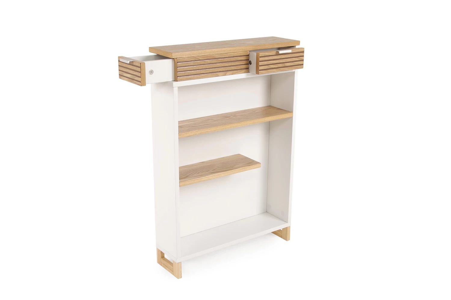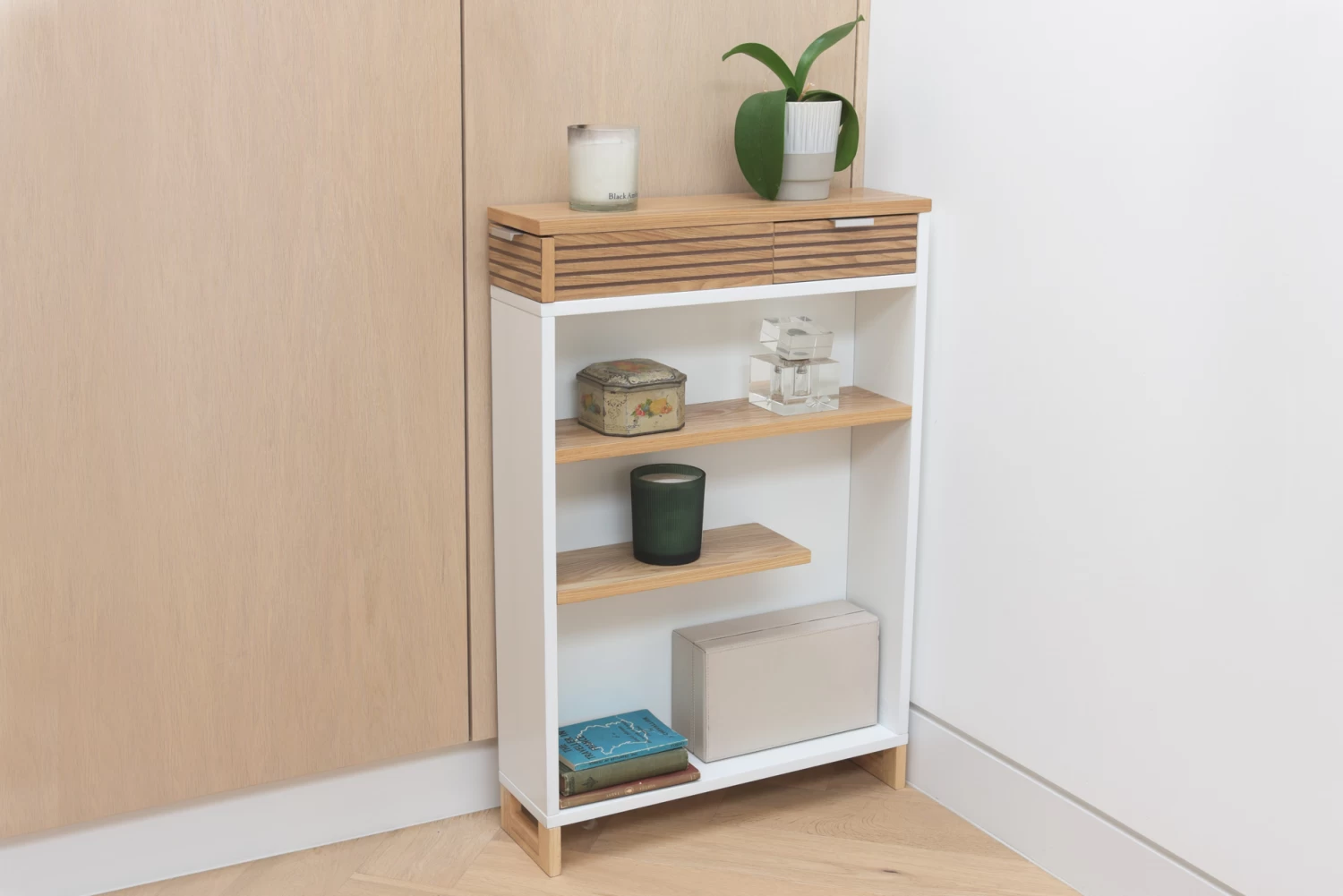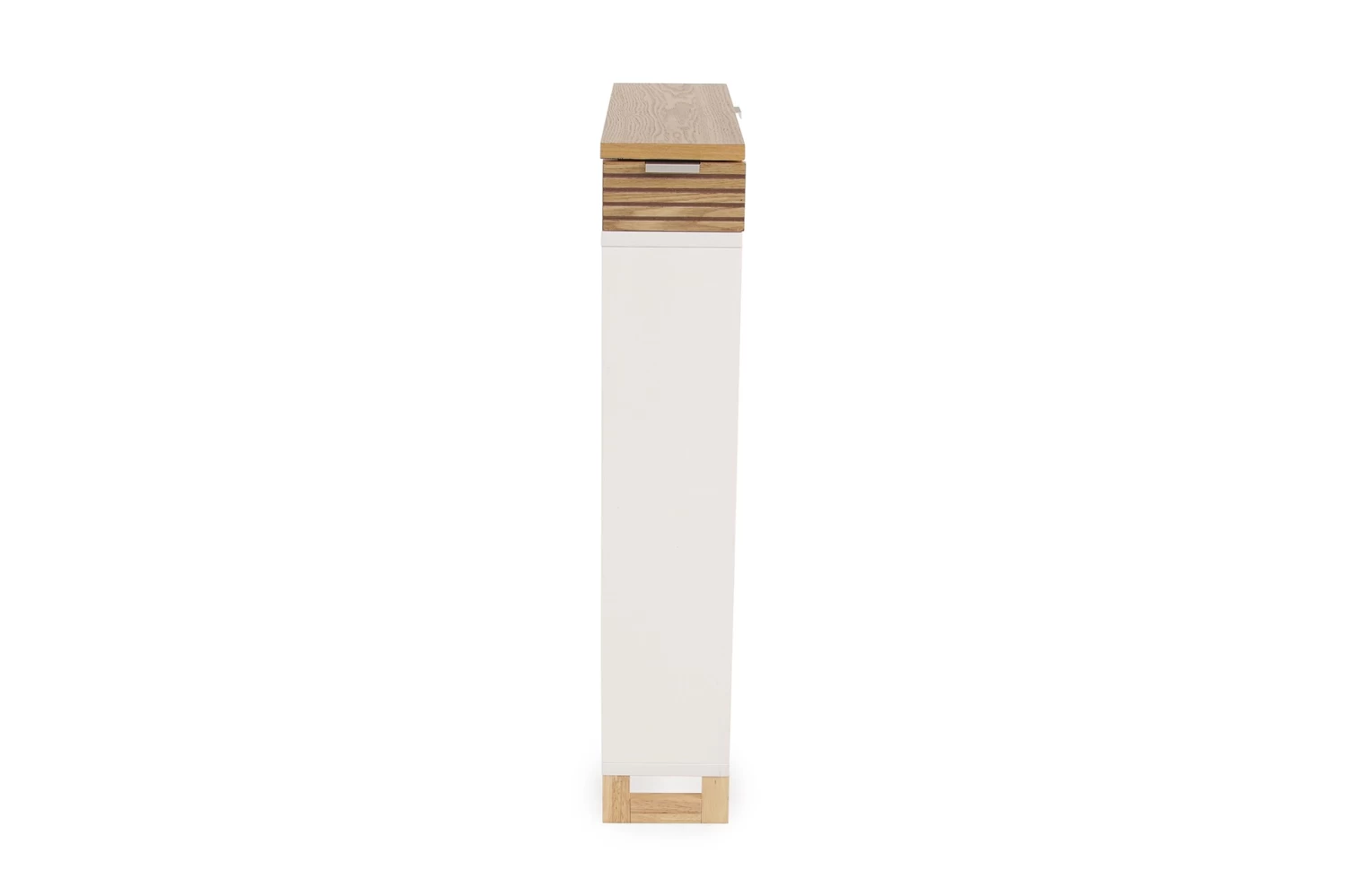 Made in white MDF and Ash Veneer with internal storage, this perky piece is a new season storage saviour!