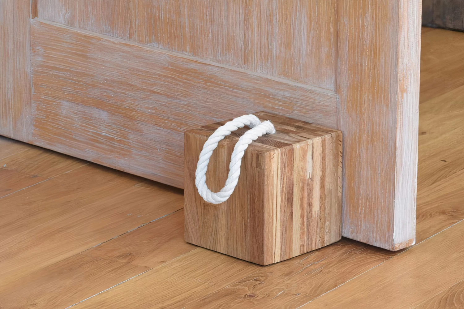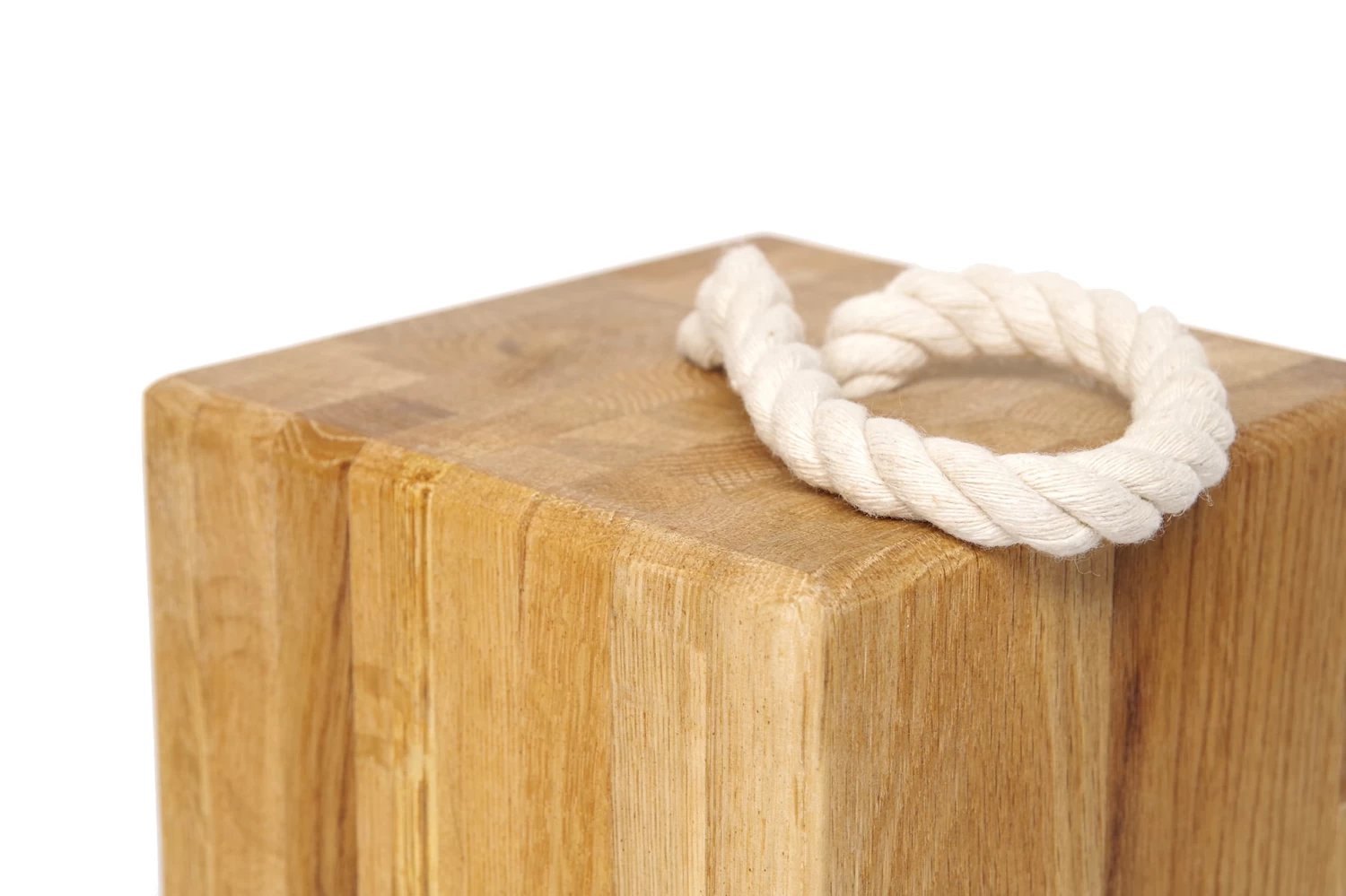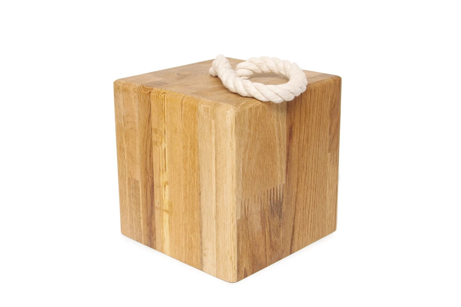 Solid oak cube shape door stop with a soft cotton rope handle.