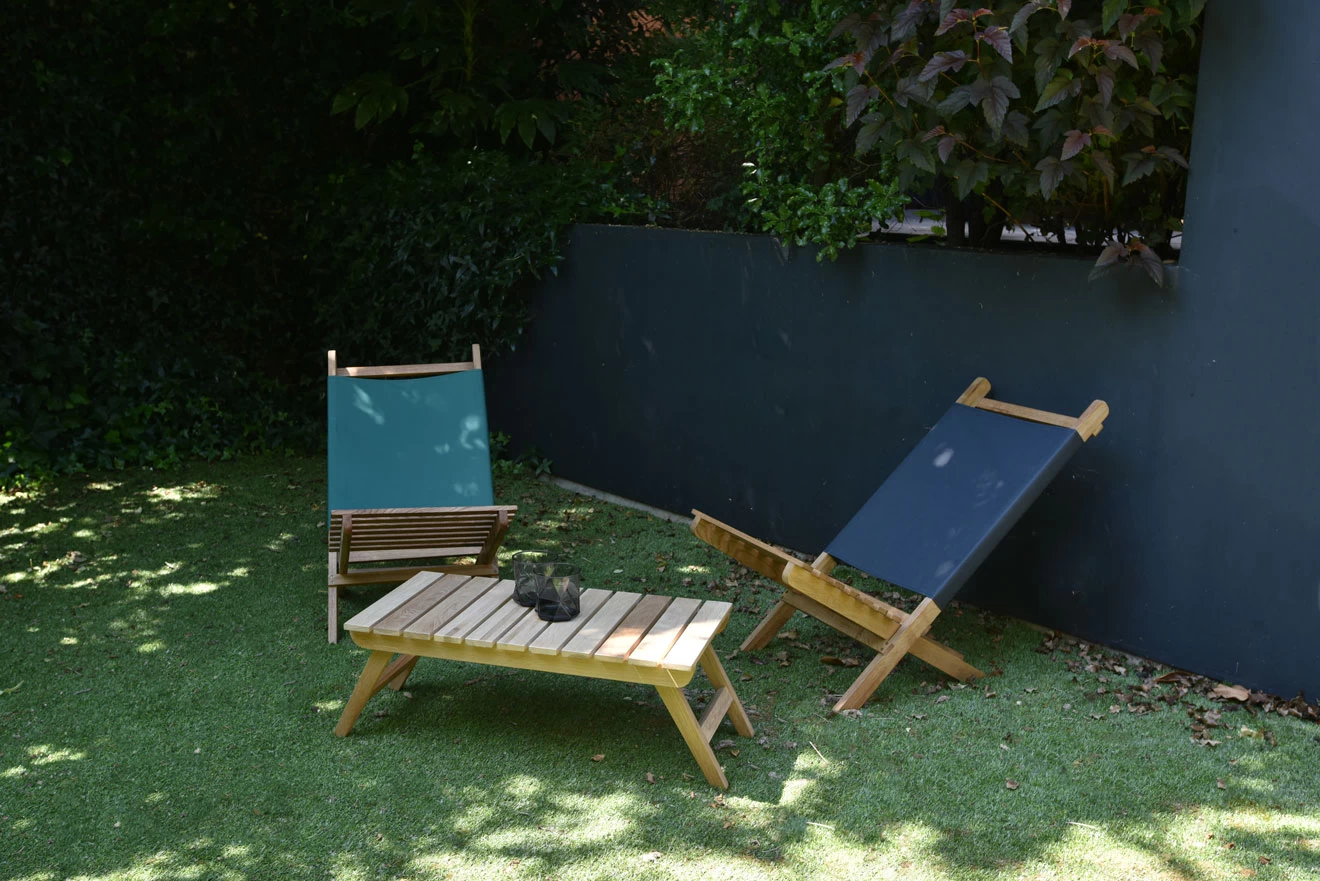 When not in use it folds away, and when needed the two pieces simply slide out to create a sleek and stylish garden chair.
