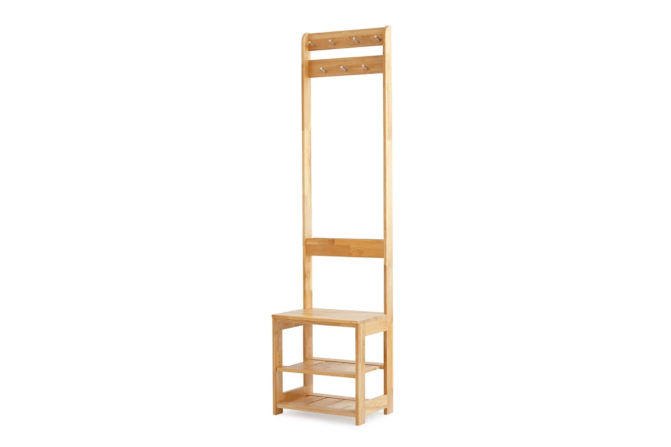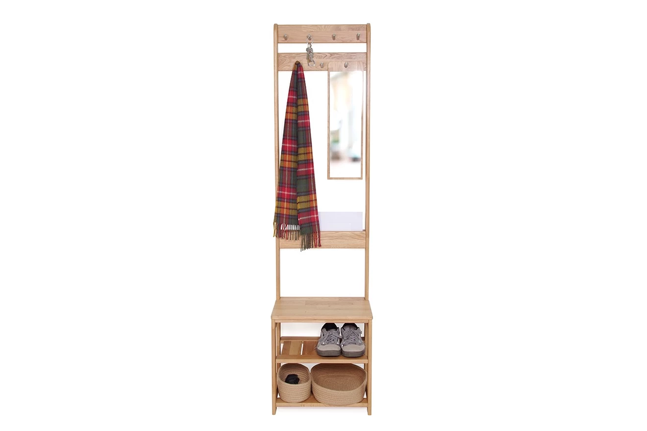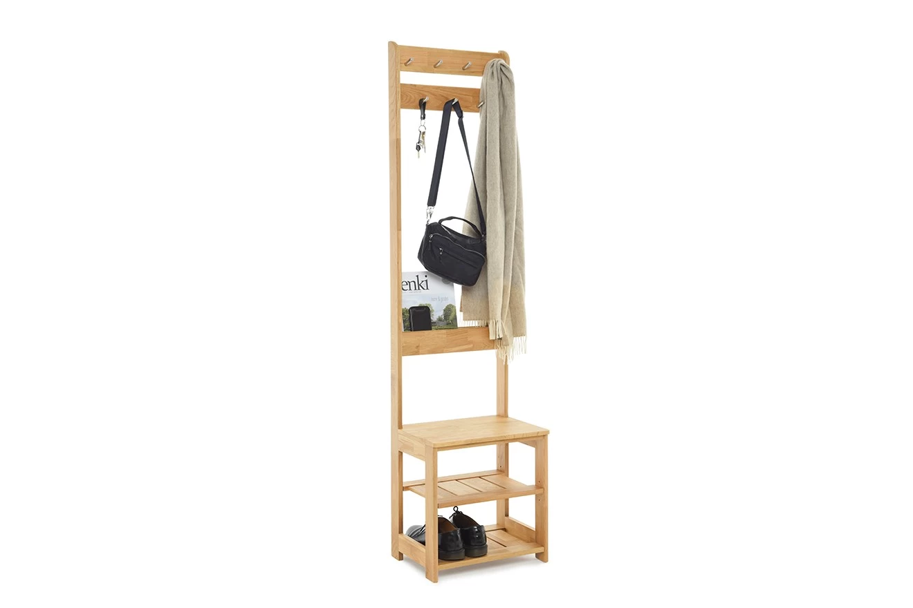 Cleverly combining sleek shelving, a handy hanging unit and savvy seating, this perky piece is thrice as nice!