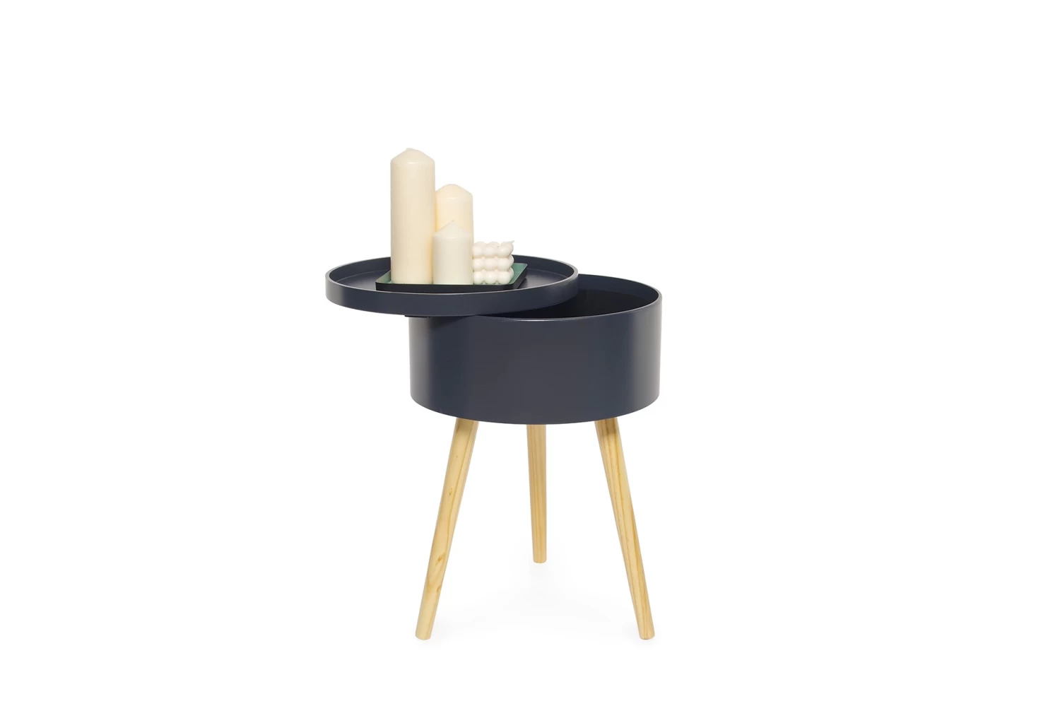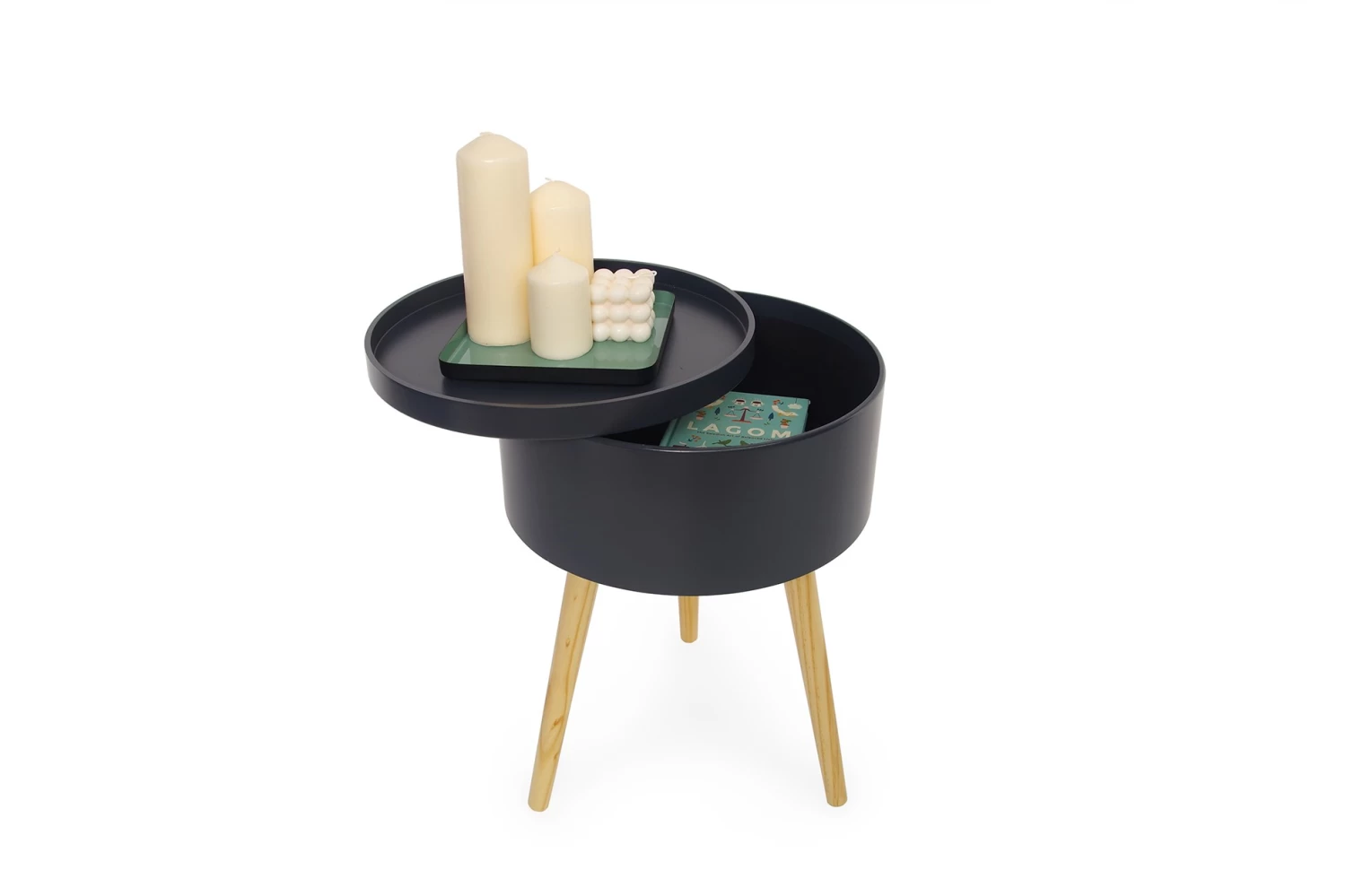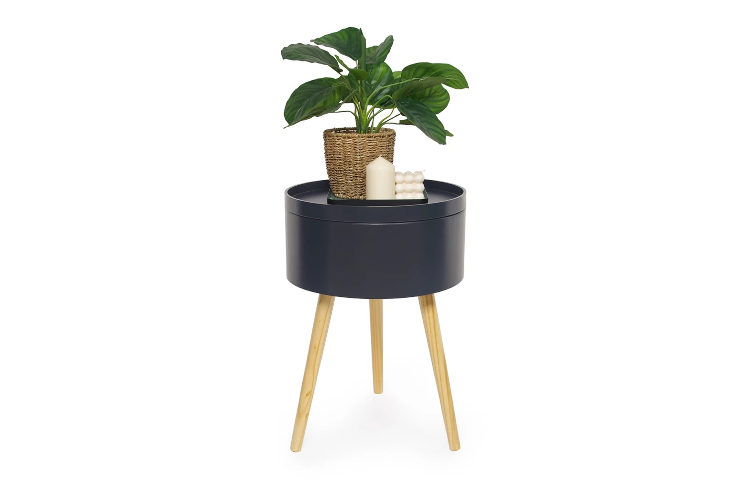 This circular side table works well in the bedroom or living room and comes complete with a lift-off tray top that reveals handy storage – the perfect hiding place for stashing remotes and phone chargers.