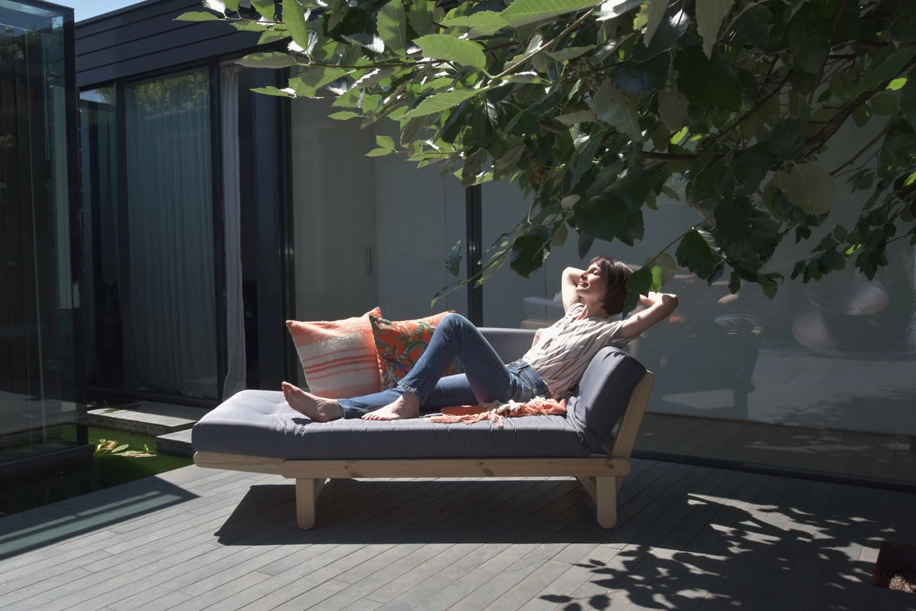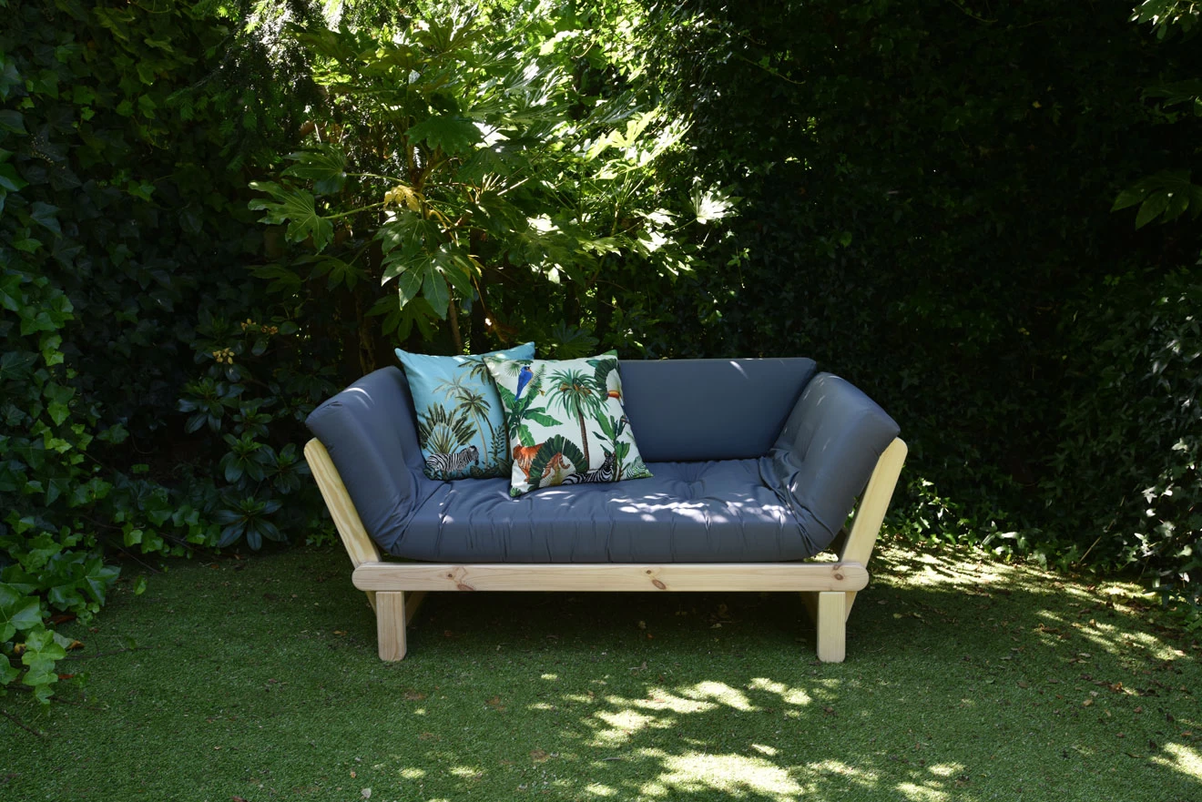 Twingle Lounger Day Bed Futon – Rest easy, our Twingle Sofa Bed is crafted from the stuff that dreams are made of. Twingle’s custom outdoor foam-filled mattress rests on a sturdy solid pine frame and is finished with a shaped back cushion. The result? A snuggly two seat sofa. But the magic doesn’t stop there. Take your comfort levels up a notch by simply adjusting the arms down to a horizontal position, transforming Twingle into a day bed or full length single bed. Perfect for lounging in your favourite sun spot!
